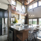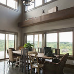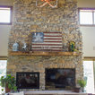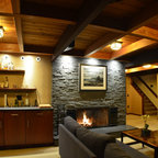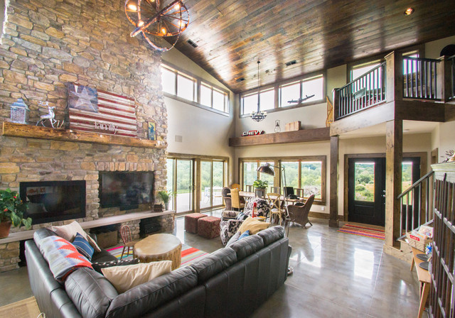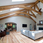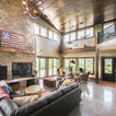 The heavy use of wood and substantial stone allows the room to be a cozy gathering space while keeping it open and filled with natural light.