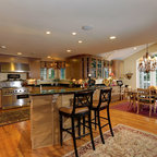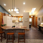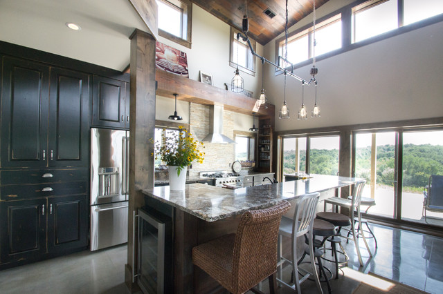 Black kitchen cabinets and the continued use of heavy wood beams provide ample space for storage and decoration while the large island allows for large gathering in this open kitchen.