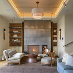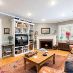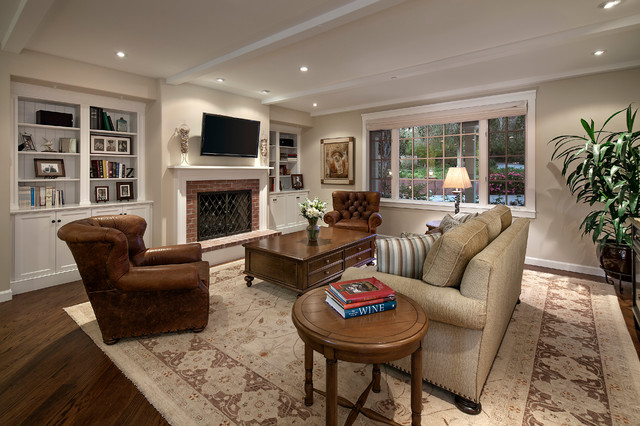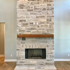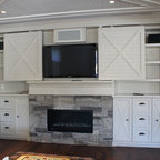 TV above brick FP w/ white built-ins to extended ceiling on each side 082217