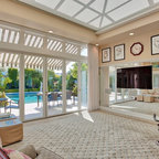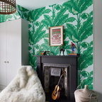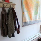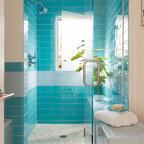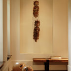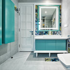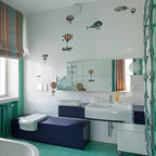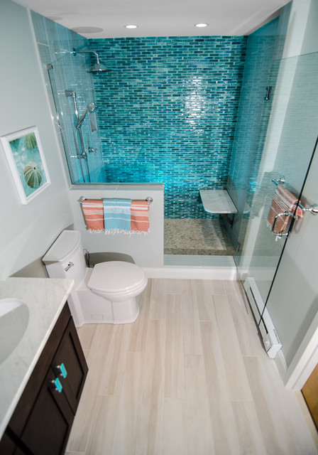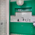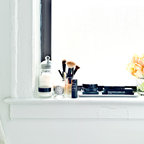 The clients wanted to bring the outside in to their seaside condo. A love of the beach and fishing were the inspirations for these bathrooms. The master is bright and airy (even though it lacks a window). We've added in small touches that evoke both the beach and boating while retaining a space that is modern and elegant. The powder room takes a trip to the darker side but still retains the slight nautical vibe. The dark walls and wood work contrast with the brass accents giving this space a moody vibe of its own. Photo Credit: Joshua Shaul