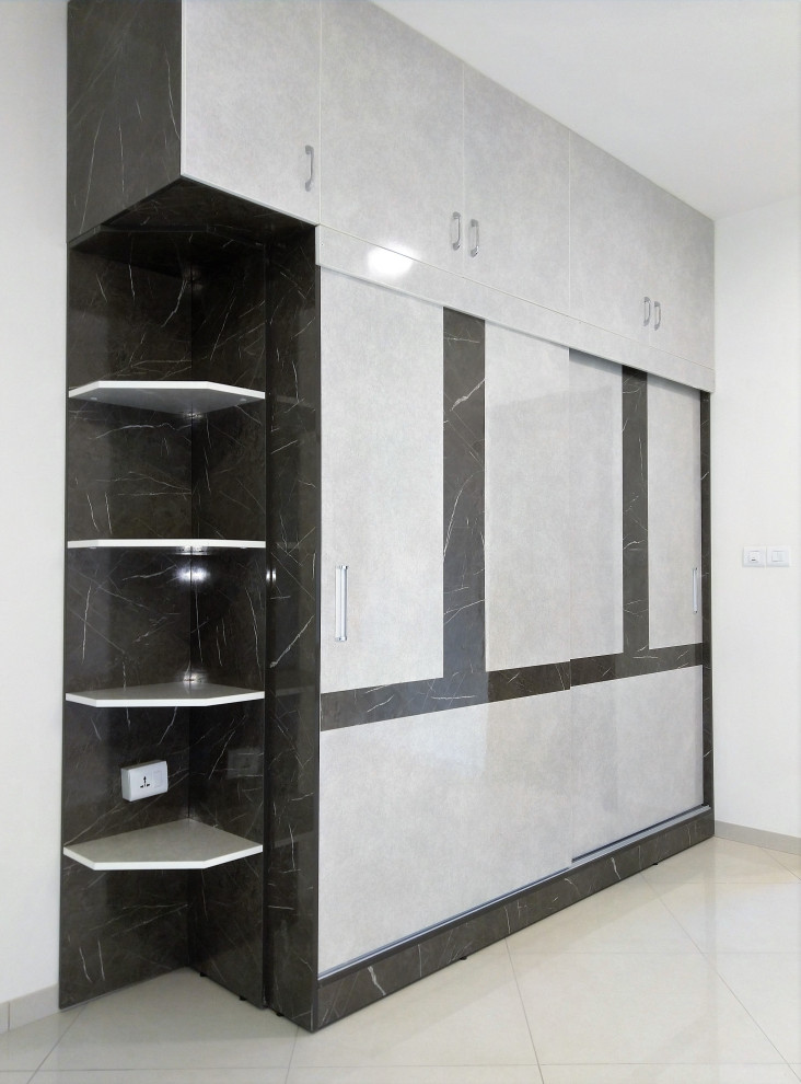 Modular Sliding Wardrobe with Loft and integrated Corner shelves in master bedroom