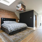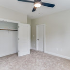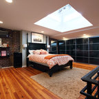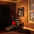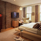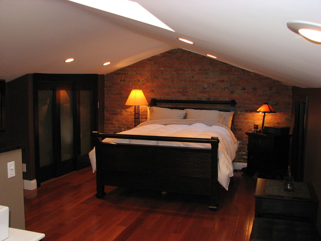 We retained the exposed brick walls throughout the home to provide character and warmth. The closet is tucked away under the eaves to maximize space.