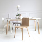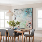 The final area to receive our magic touch was the dining room and kitchen. Many of the larger pieces were already in place, but the rooms needed dressing to bring them to life. Minty greens, cool greys and soft pinks work back perfectly with a blonde timber dining table a fresh white kitchen.