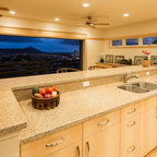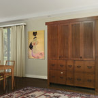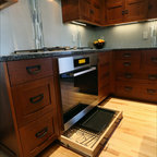 This image shows the UK72’s pocket bi-fold doors opened to reveal the counter top with storage areas above, 2 burner ceramic cook top, 18 ga. stainless steel sink, and GE’s incredible Advantium oven/exhaust hood, the oven that can cook anything. YesterTec’s patented, UL Listed safety features do not allow the oven and cook top to operate when the bi-fold doors are closed in front of them. Below the solid surface counter top is the refrigerator/freezer, single drawer/dishwasher and more storage areas. The UK72’s extra depth (3” deeper) allows for more storage and counter space than our other Mini-kitchen line.