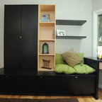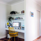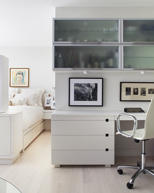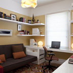 This guest room–office combination is permanent but still separate. You don't have to look at a workspace while you are resting, and you don't have to be tempted by a nap space while you're working. Or just everyday bedroom.