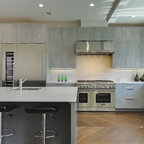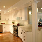 floor tiles color with white cabs - interesting yet neutral and blends, adds interest - with white & stainless cabs. ovens or fridge replacing tall current ovens.. compact use of galley kitchen, possible pass thru shown