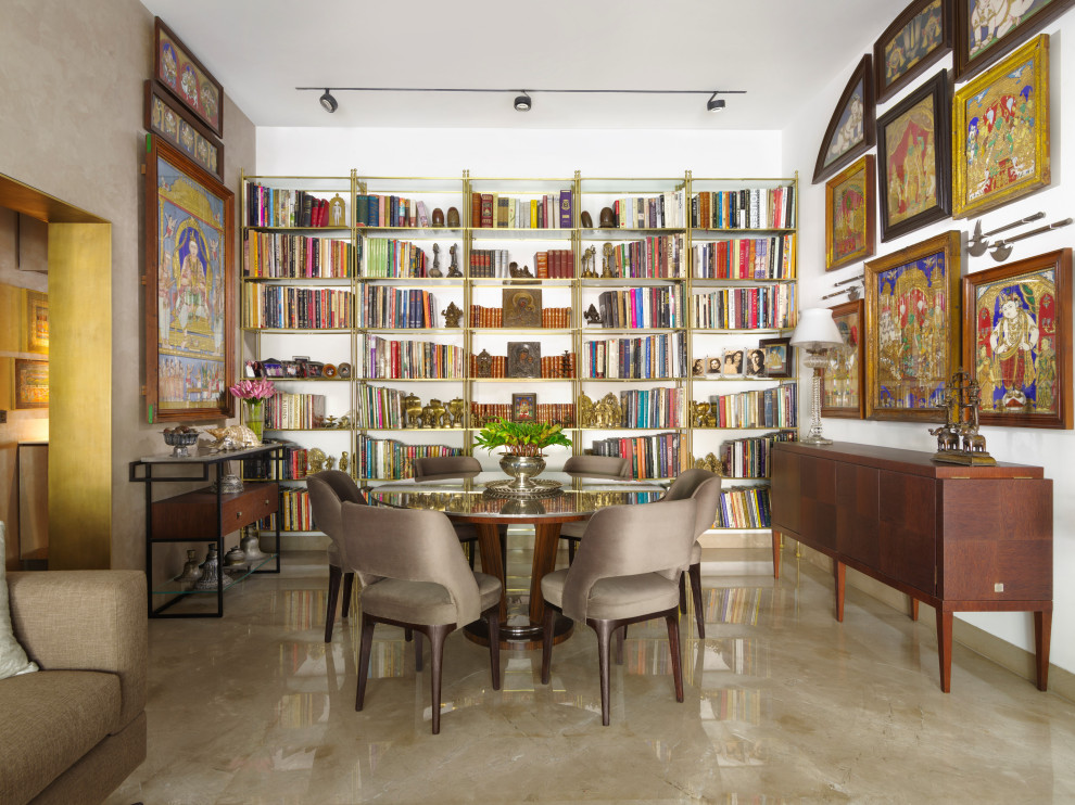 At one end of the longitudinal view of the Living Room are seen collections of "everyday" objects, both secular and religious, which are placed between the family's extensive library of books in the wall-to-wall brass bookcases designed over forty years ago by Rome Kohli. Tanjore paintings in the Vaishnavite theme are placed above a Ruhlmann sideboard. The recent renovations by Kohelika included high-tech lighting and sound systems and a complete change of flooring. The door between the Living Room and Gallery was removed and replaced with an architrave in solid brass.