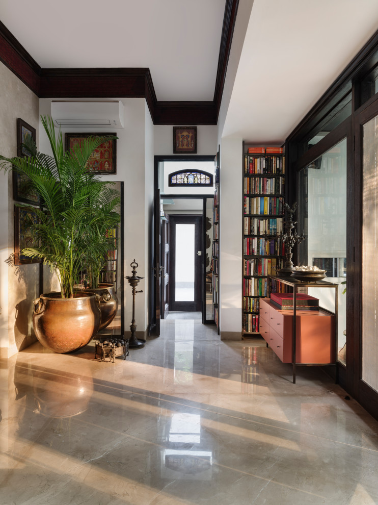 Early morning sunlight streaks into the east-facing Living Room, that leads into the adjoining Pantry. The wooden cornice is novel as it has an insert of an antique Kurdish tent carpet runner.