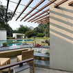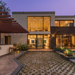 House exterior with patio; light fixtures on first and second flooors; exterior pool.