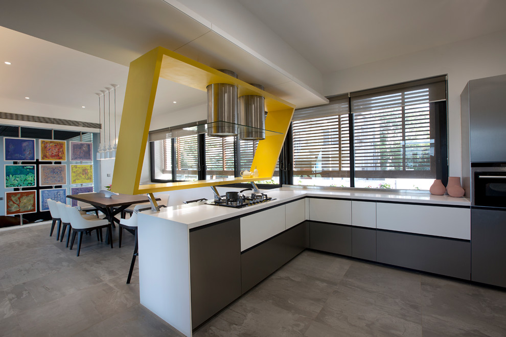 In this semi-open kitchen by Sunil Patil and Associates, a rhomboid service window houses the kitchen chimney and...