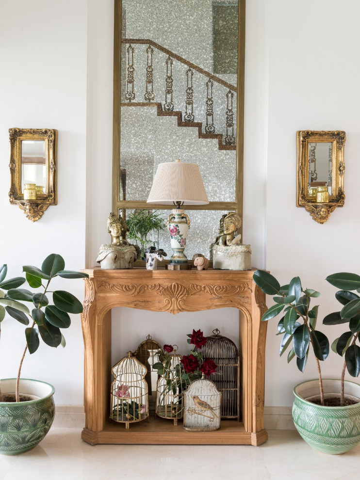 aestheticized it through the contrasting interplay of minimalism and maximalism. This aesthetic dichotomy is achieved by using a minimal neutral palette and dramatic styling of oversized mirrors, sculptures, and art. Sumptuous finishes like that of muted and antiqued brass add accent to doors, sculptures, furniture, and chandeliers. Vintage switches lend an air of old-world elegance into the mix. The diverse inventory of antiques, art, and artifacts we have collected over the years from our travels across India and abroad show up everywhere in the