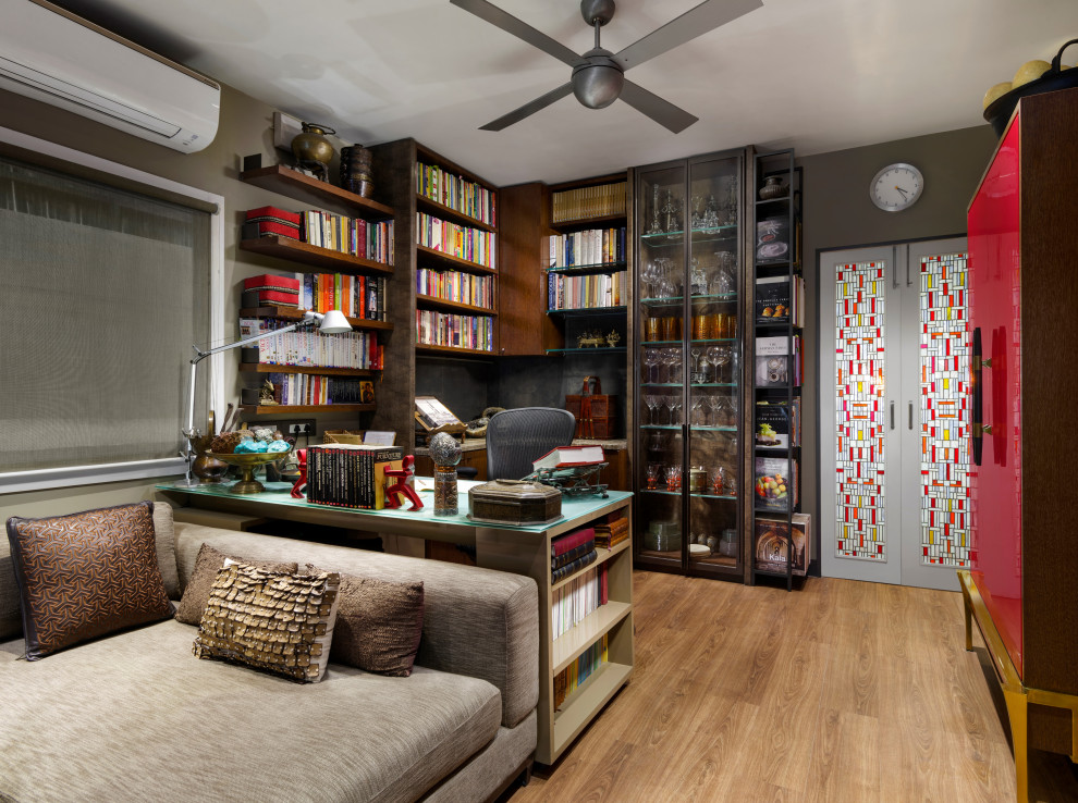 The Study continues to use the stained glass doors, inspired by Frank Lloyd Wright, from this home's earlier avatar.
