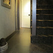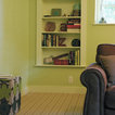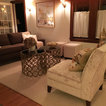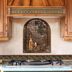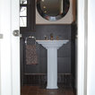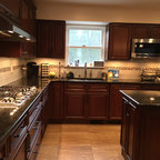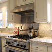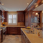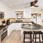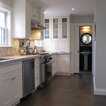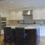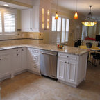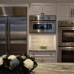 Transitional kitchen with custom cabinets & powder room with marble floor