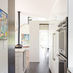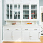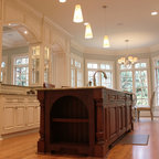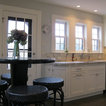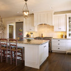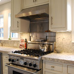 Custom renovation of 1930's boston area kitchen. The interior space was fully gutted and windows replaced, but the footprint of the existing kitchen was not changed. Counters are honed Bianco Romano granite with special 2 inch wide mitred edge. Stove is 36" Thermador.