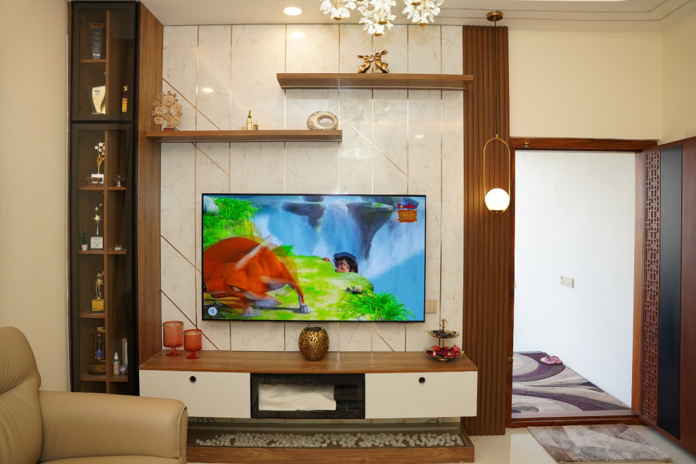 A sleek and functional TV unit with smart storage, elegant finishes, and ambient lighting—designed to blend seamlessly with the living space while enhancing entertainment appeal.
