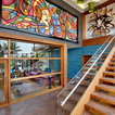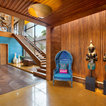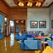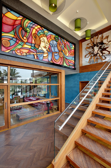 The floating staircase leading to the first floor is housed within an atrium. A stained-glass mythological mural of Radha and Krishna, measuring 30x9 feet, forms a commanding centrepiece. A suspended floral sculpture made of petrified wood roots urges the eye upwards.
