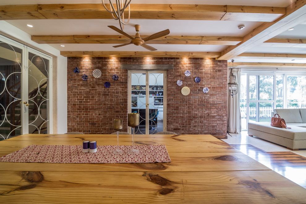 The dining room is decorated with a large wooden table and upholstered chairs by D.S. Doors, Faridabad. “We used an...
