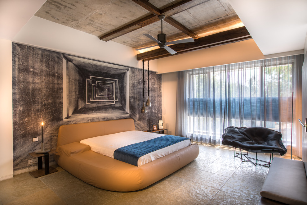 7. A wall-to-wall visual behind the bed brings depth and drama to this room. This black-and-white trompe l’oeil...