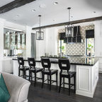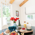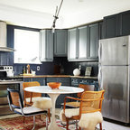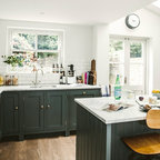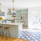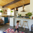 Digging the ceiling and floor materials here: wood planks, warm black beams, gray tile (or tile like) floor. thoughts? I kinda love this direction for the whole space. AS: I like this, but one question, will it be too much to have wood ceilings in the sun porch if the kitchen has white ceilings? The wood might make it more interesting. SY: I think we'd unify the spaces and give both wood ceilings. AS: the more I think about this, the more I like it. SY: 9/19 So, we love this too, but we've had to shift to white beams and white ceiling. The one beam that in necessary divides kitchen from porch where the house's exterior wall is, and will be substantial, and the kitchen's ceiling is low. Keeping it all white will make the ceiling feel higher, and the beam(s) feel less imposing. I don't want to lose this inspiration image, though! This floor is great, and this is a great overall effect to go for in your someday kitchen - we'll just find other ways to bring in the wood! AS:Ok- thats fine too! and if it doesn't make sense to bring in wood. thats ok too. SY: check.